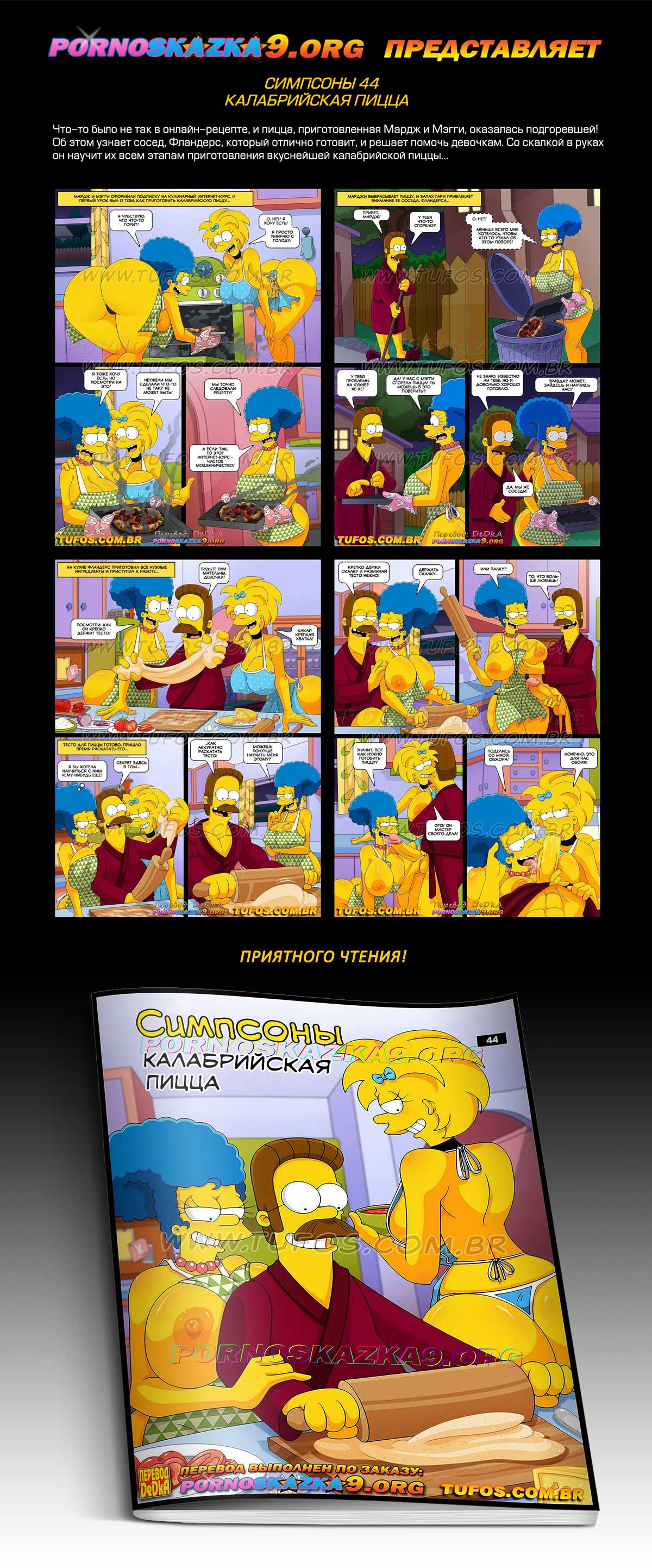 Порно комикс «Симпсоны. Часть 44. Калабрийская пицца.» Что-то было не так в онлайн-рецепте, и пицца, приготовленная Мардж и Мэгги, оказалась подгоревшей! Об этом узнает сосед, Фландерс, который отлично готовит, и решает помочь девочкам. Со скалкой в руках он научит их всем этапам приготовления вкуснейшей калабрийской пиццы…